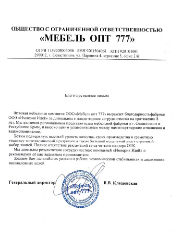 "Империя Идей" - российский производитель и поставщик удобной и доступной мягкой мебели. Фабрика основана в 1999 году и за 26 лет успешной работы превратилась из мини-цеха площадью 400 кв. м в масштабное высокотехническое производство. Сегодня "Империю Идей" знают в 28 регионах страны. Мебель продается по всей России, включая Республики Крым и Мордовия, а так же в Казахстане. Компания ориентирована на долгосрочные партнерские отношения с оптовыми клиентами.
