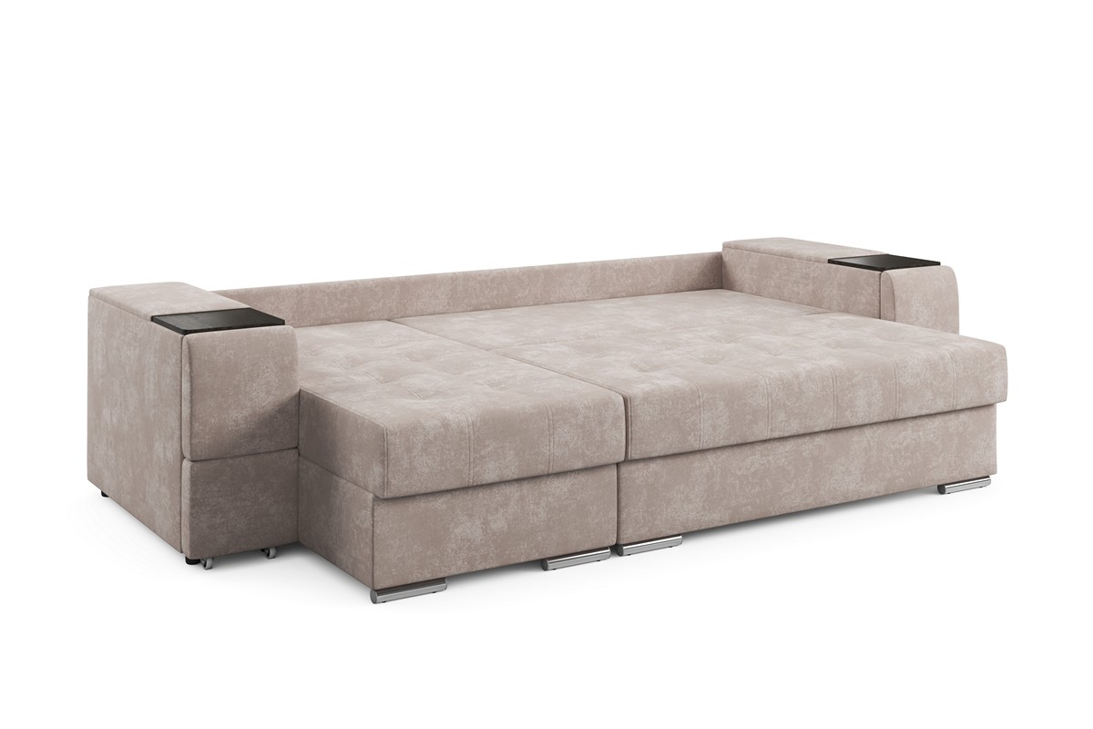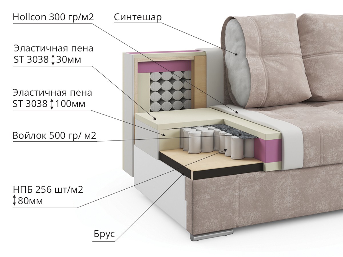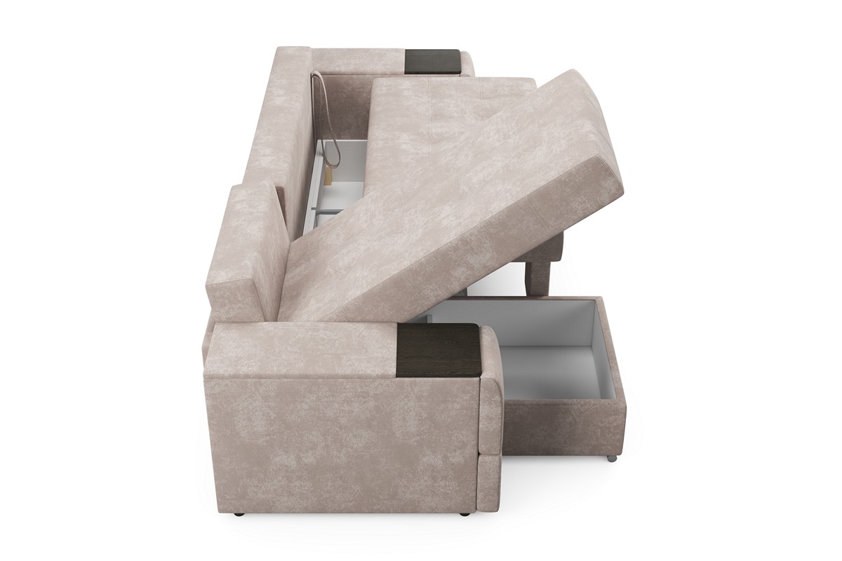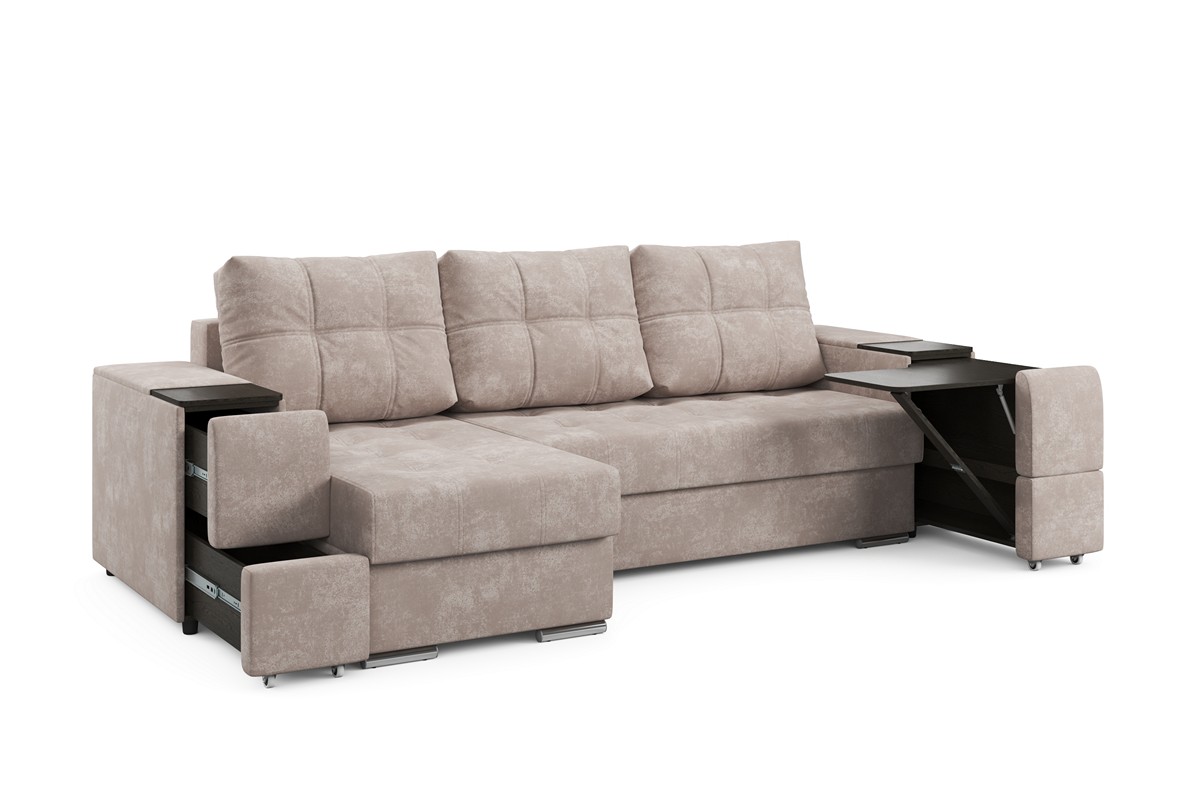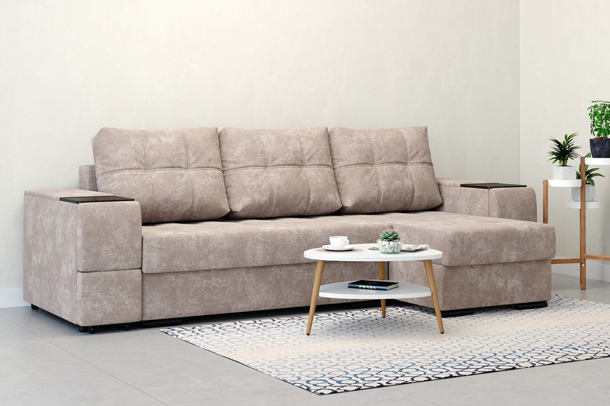 Угловой диван «Бруклин» — это сочетание комфорта и функциональности. За качество отдыха и сна отвечает эластичный наполнитель и независимый пружинный блок. Для хранения постельного белья может использоваться угловая ниша, деревянные подлокотники позволяют разместить нужные предметы. Отдельного внимания заслуживает раскладной столик, размеров которого вполне достаточно для организации рабочего места. Диван подходит для ежедневного сна за счет большого спального места и удобного механизма трансформации.